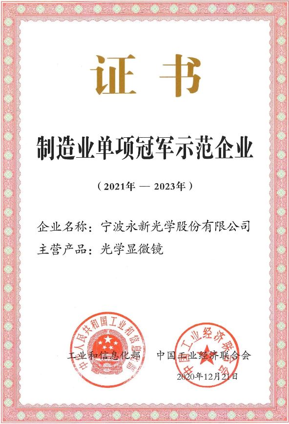 公司于2017年參與國家第二批制造業(yè)單項冠軍企業(yè)評選,并憑借產(chǎn)品——光學顯微鏡,成功入選第二批國家制造業(yè)單項冠軍培育企業(yè)。按照國家工信部要求,本次成功通過復評升級為國家級制造業(yè)“單項冠軍示范企業(yè)”,這既是國家與市場對永新光學產(chǎn)品的肯定,也是永新光學自身實力強有力的證明,有助于更好激發(fā)公司不斷開拓創(chuàng)新,積極研發(fā)新產(chǎn)品。