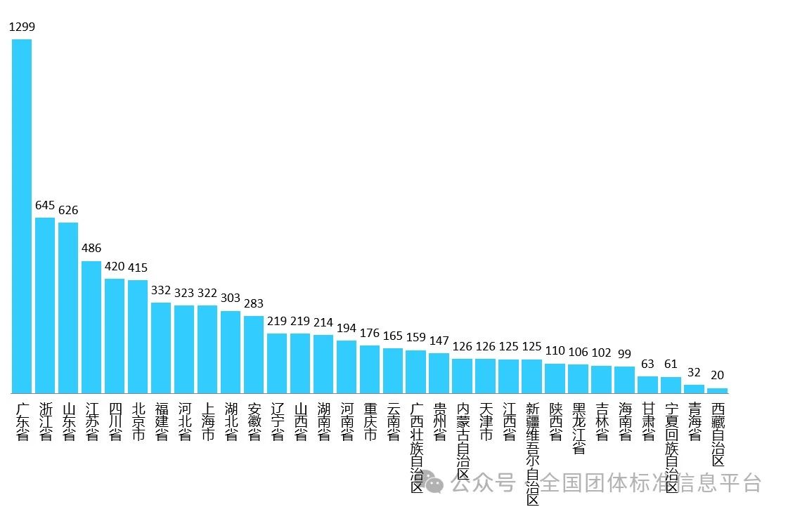 截至2024年6月30日,廣東省、浙江省、山東省、江蘇省等31個省、自治區、直轄市的社會團體在全國團體標準信息平臺注冊,其中廣東省社會團體注冊數最多,為1299家,占社會團體注冊總數的14.3%。