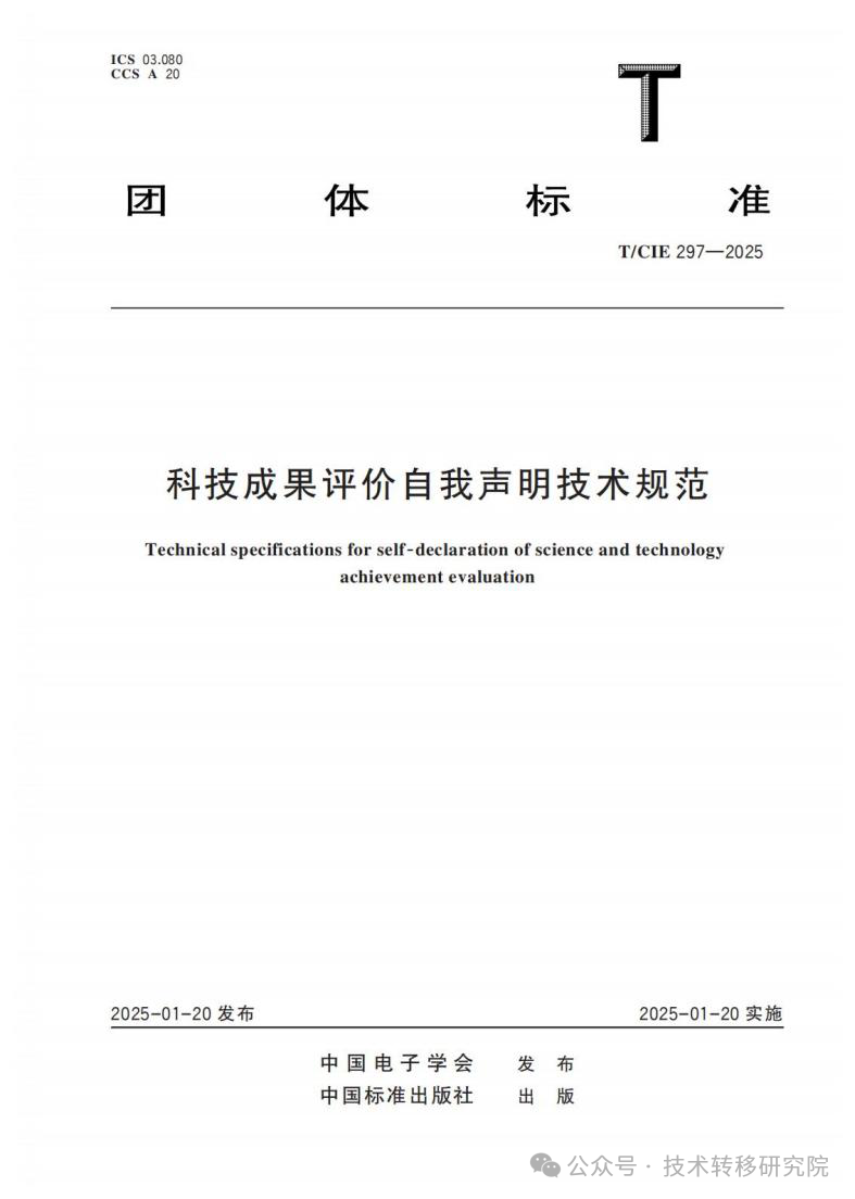 近日,我國科技成果評價領(lǐng)域自我聲明團體標(biāo)準(zhǔn)《科技成果評價自我聲明技術(shù)規(guī)范》(T/CIE 297 - 2025)正式發(fā)布。
