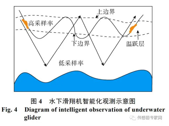 海洋傳感器的智能化特征還體現(xiàn)在故障自診斷、自修復(fù)以及在觀測(cè)過(guò)程中對(duì)被觀測(cè)對(duì)象的特征進(jìn)行智能化判斷方面。以水下滑翔機(jī)為例, 如圖 4 所示, 未來(lái)智能化的觀測(cè)平臺(tái)以及傳感器,可以按照特殊的科學(xué)研究觀測(cè)需求, 進(jìn)行邏輯判斷和自適應(yīng)采樣率動(dòng)態(tài)控制, 在溫躍層等重點(diǎn)關(guān)注區(qū)域進(jìn)行加密測(cè)量, 其他區(qū)域則降低觀測(cè)密度,這樣既可以降低功耗, 又可以增加在位時(shí)間。智能化傳感器與平臺(tái)電源管理、運(yùn)動(dòng)速度和姿態(tài)協(xié)調(diào)相適應(yīng), 可以獲取更多有效的觀測(cè)數(shù)據(jù)質(zhì)量,提高觀測(cè)效能。