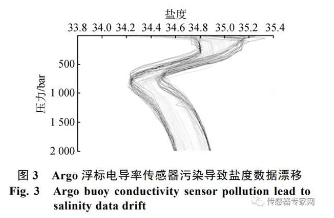 在水下無(wú)人系統(tǒng)中, 以在海洋 0~2000 m 范圍上下往復(fù)做剖面運(yùn)動(dòng)的 Argo 浮標(biāo)為例, 其壽命要長(zhǎng)達(dá) 3 年, 電導(dǎo)率傳感器受海洋生物附著等影響, 會(huì)產(chǎn)生鹽度數(shù)據(jù)漂移, 如圖 3 所示。全球大洋 2 000 m 水深的海水鹽度基本為一定值, 但從該圖中明顯看出, 經(jīng)過(guò)多個(gè)剖面測(cè)量后, 鹽度數(shù)據(jù)已經(jīng)漂移了近 0.3, 嚴(yán)重影響觀測(cè)數(shù)據(jù)質(zhì)量。