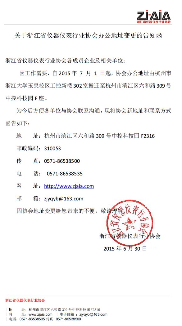 關于浙江省儀器儀表行業協會辦公地址變更的通知