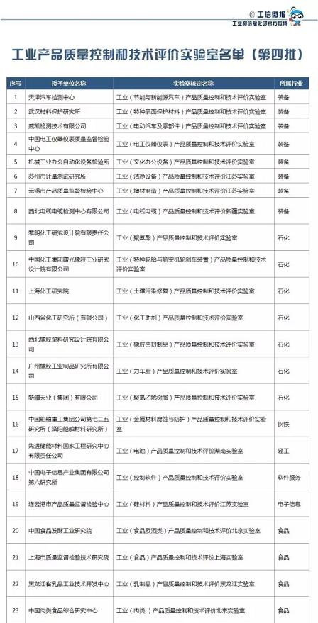 為貫徹落實《中國制造2025》,推進制造強國建設,依據(jù)《工業(yè)產(chǎn)品質量控制和技術評價實驗室管理辦法》(工信部科〔2010〕93號)和《工業(yè)產(chǎn)品質量控制和技術評價實驗室核定細則(暫行)》(工信廳科〔2010〕143號),經(jīng)工業(yè)產(chǎn)品質量控制和技術評價實驗室專家技術委員會審議,現(xiàn)將“工業(yè)(節(jié)能與新能源汽車)產(chǎn)品質量控制和技術評價實驗室”等23家第四批工業(yè)產(chǎn)品質量控制和技術評價實驗室名單(見附件)予以公布。