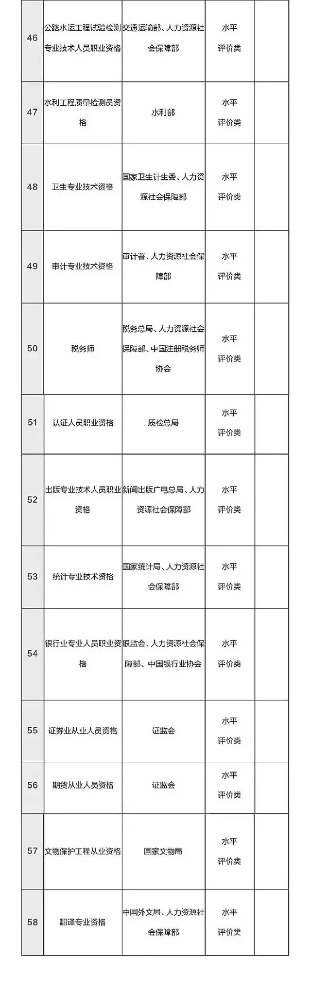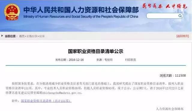 12月16號,人力資源和社會保障部公示了國家職業資格目錄清單,擬列入職業資格目錄清單151項。其中,專業技術人員職業資格58項,技能人員職業資格93項。