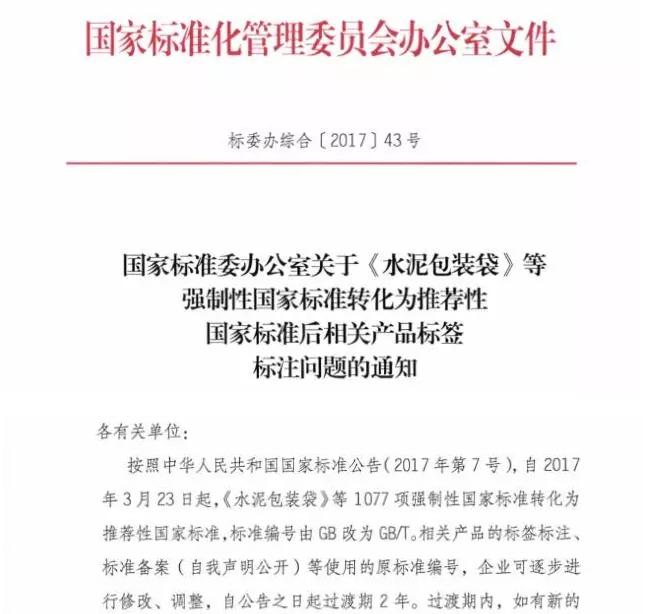 3月23日,國家質檢總局、國家標準委發布了《關于<水泥包裝袋>等1077項強制性國家標準轉化為推薦性國家標準的公告》,公告稱:自公布之日起,上述標準不再強制執行,標準代號由GB改為GB/T,標準順序號和年代號不變。