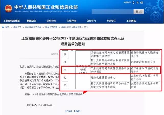 近日,國家工業與信息化部公布《2017年制造業與互聯網融合發展試點示范項目名單》,經各組織單位推薦、專家組評審、網上公示等環節,確定全國70個項目入選名單。中易和節能“工業能源信息在線管理服務平臺建設項目”憑借業內領先的工業大數據技術及創新的應用模式成功入選。