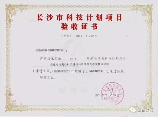 近日,湖南赫西儀器裝備有限公司收到長沙市科學技術局發來的驗收證書。我公司承擔的2012年度長沙市科技計劃項目:高速冷凍離心機關鍵材料的開發及成套技術應用(計劃文號:長財企指【2012】33號 計劃編號:K1203190-11)已通過驗收。
