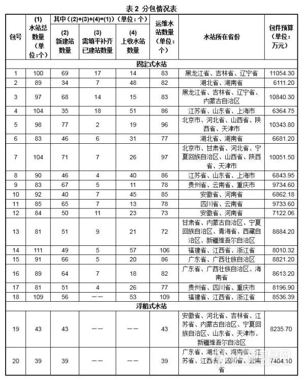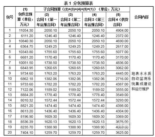 2018年1月31日,中國政府采購網(wǎng)發(fā)布《中國環(huán)境監(jiān)測總站國家地表水自動監(jiān)測系統(tǒng)建設(shè)及運(yùn)行維護(hù)項(xiàng)目(包1至包20)公開招標(biāo)公告》,此項(xiàng)目總預(yù)算為168445.45 萬元,將分為20包,且有些包數(shù)同一廠商不能同時中標(biāo)。