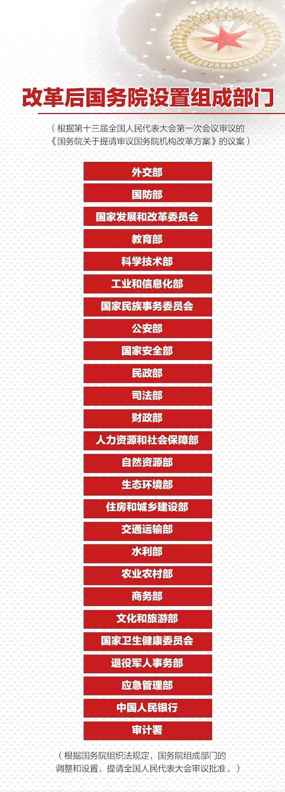 改革后,除國(guó)務(wù)院辦公廳外,國(guó)務(wù)院設(shè)置組成部門26個(gè)。