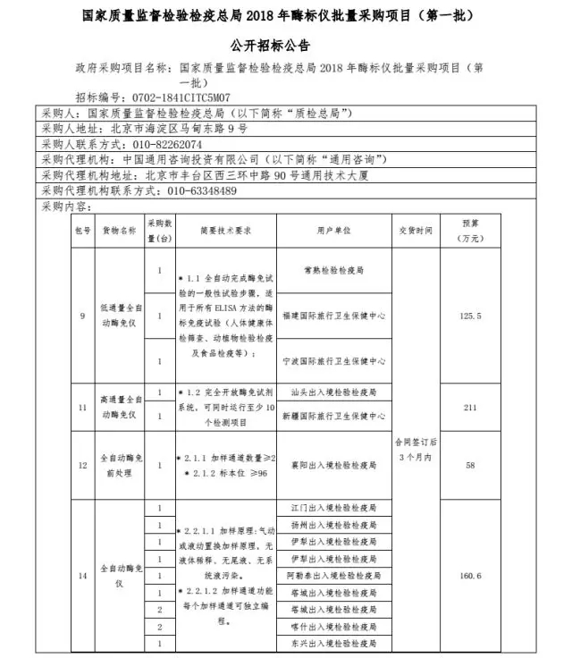 國家質檢總局現就2018年酶標儀批量采購項目(第一批)進行公開招標,采購項目涉及貨物、通用設備、儀器儀表及其他儀器儀表,預算977.3萬元。有興趣的投標人,可以在2018年3月31日前投遞標書,2018年4月4日開標。