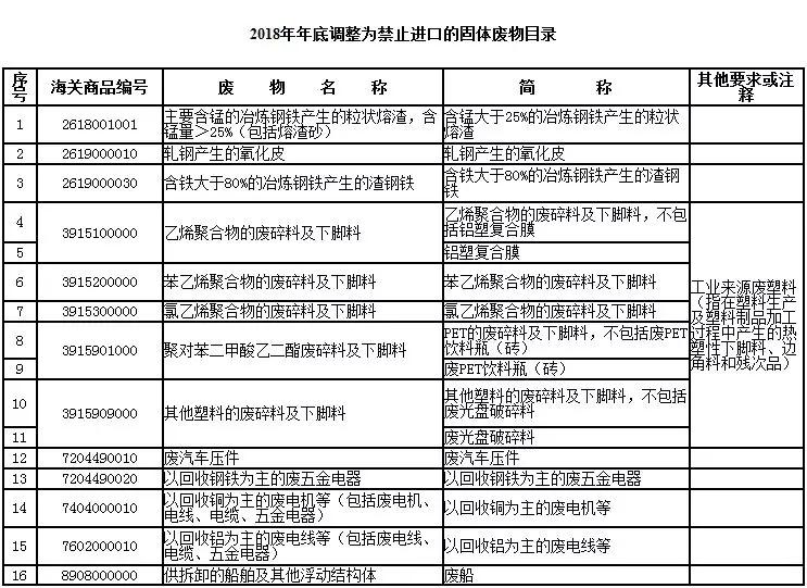 一、將廢五金類、廢船、廢汽車壓件、冶煉渣、工業來源廢塑料等16個品種固體廢物(見附件1),從《限制進口類可用作原料的固體廢物目錄》調入《禁止進口固體廢物目錄》,自2018年12月31日起執行。