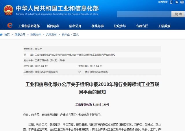 2018年4月23日,工業(yè)和信息化部辦公廳發(fā)布了工信廳信軟函〔2018〕139號通知,《工業(yè)和信息化部辦公廳關于組織申報2018年跨行業(yè)跨領域工業(yè)互聯(lián)網(wǎng)平臺的通知》(以下簡稱《通知》)。