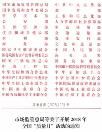 2018年9月,市場監(jiān)管總局聯(lián)合中共中央宣傳部、教育部、工業(yè)和信息化部、銀保監(jiān)會、全國總工會、共青團中央、機械工業(yè)聯(lián)合會等共34個部門,以“加強市場監(jiān)管 建設(shè)質(zhì)量強國”為主題,共同部署開展2018年全國“質(zhì)量月”活動。