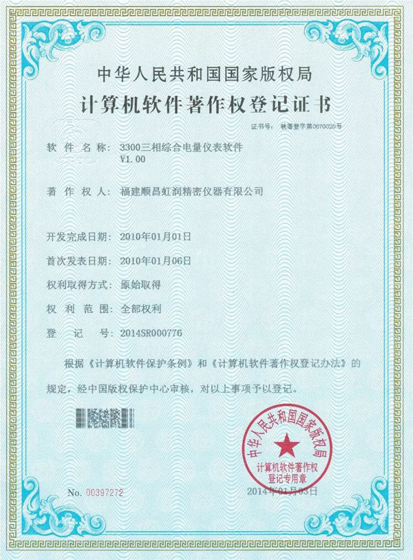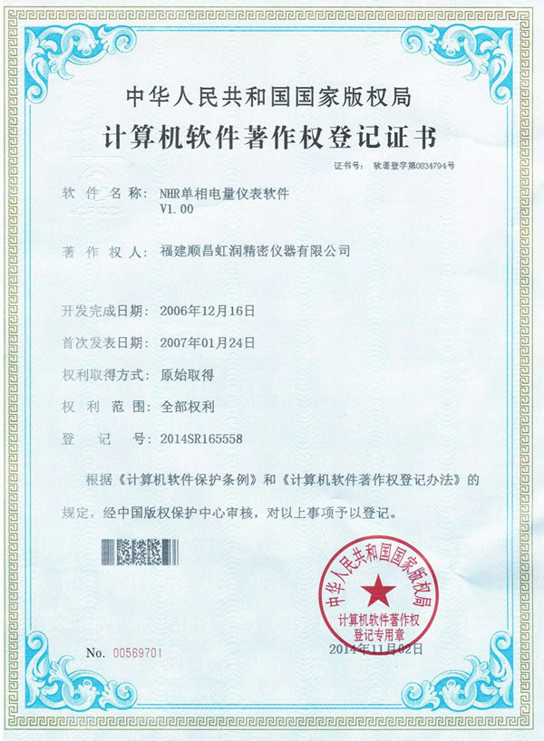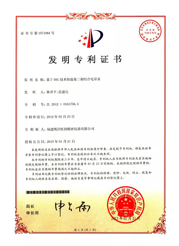 虹潤綜合電量顯示儀表是是一種用于交流電量綜合參數(shù)測量智能儀表。產(chǎn)品應(yīng)用公司自主知識產(chǎn)權(quán)開發(fā),榮獲基于DSC技術(shù)的盤裝三相綜合電量表(專利號2012101617565)國家發(fā)明專利,3300三相綜合電量儀表軟件V1.00(版權(quán)登記號2014SR000776)、NHR液晶綜合電量集中顯示儀軟件V1.00(版權(quán)登記號2014SR139231)、NHR單相電量儀表軟件V1.00(版權(quán)登記號2014SR165558)3項(xiàng)軟件著作權(quán)。