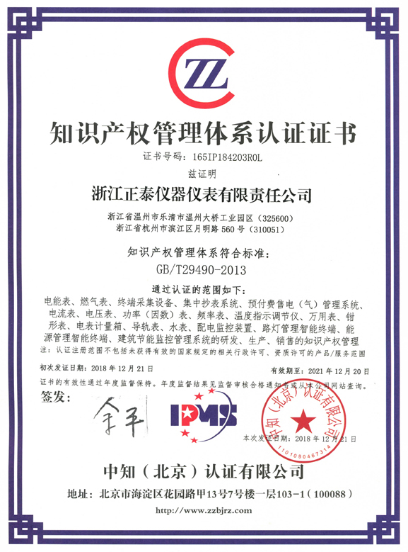 12月21日,浙江正泰儀器儀表有限責(zé)任公司(以下簡稱“正泰儀表”收到了國內(nèi)權(quán)威知識(shí)產(chǎn)權(quán)認(rèn)證機(jī)構(gòu)中知(北京)認(rèn)證有限公司頒發(fā)的知識(shí)產(chǎn)權(quán)管理體系認(rèn)證證書,這意味著正泰儀表公司在知識(shí)產(chǎn)權(quán)領(lǐng)域獲得到重要認(rèn)可,在知識(shí)產(chǎn)權(quán)方面得到進(jìn)一步規(guī)范以及綜合競(jìng)爭(zhēng)力進(jìn)一步提升。