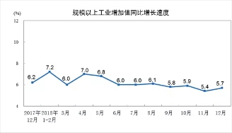 2018年12月份,規模以上工業增加值同比實際增長5.7%(以下增加值增速均為扣除價格因素的實際增長率),增速比11月份加快0.3個百分點;環比增長0.54%。2018年全年,規模以上工業增加值同比增長6.2%,增速較1-11月份回落0.1個百分點。