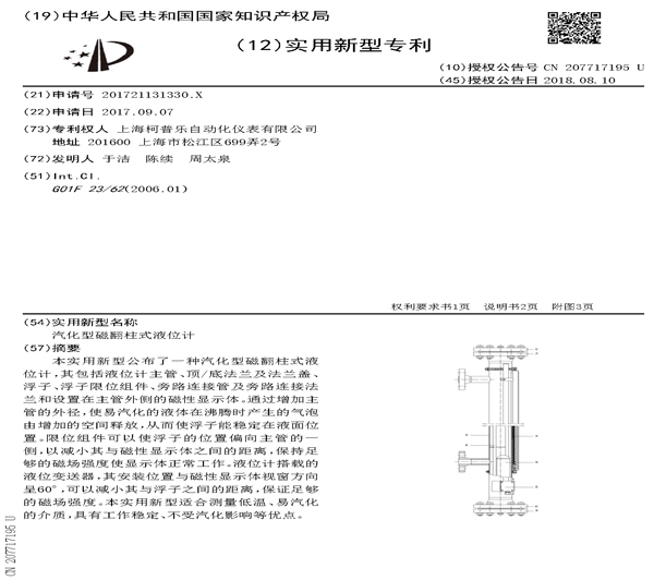 上海柯普樂自動化儀表有限公司最近獲得了三個型號液位計產品的實用新型專利授權,分別是:衛生型、汽化型和低溫低密度型。這三款產品通過獨特的設計、材料及工藝滿足在不同行業的特殊工藝要求,如:食品及飲料、醫藥、液化氣、乙烯制造。此三項專利申請中共有11項權利要求得到保護,日前已收到了國家知識產權局的授權通知,預計將在一個月左右收到專利證書。專利申請的通過,使得知識產權得以保護,提升了柯普樂的品牌形象,同時也鼓勵柯普樂人更加深入地貼近客戶和了解各種應用。