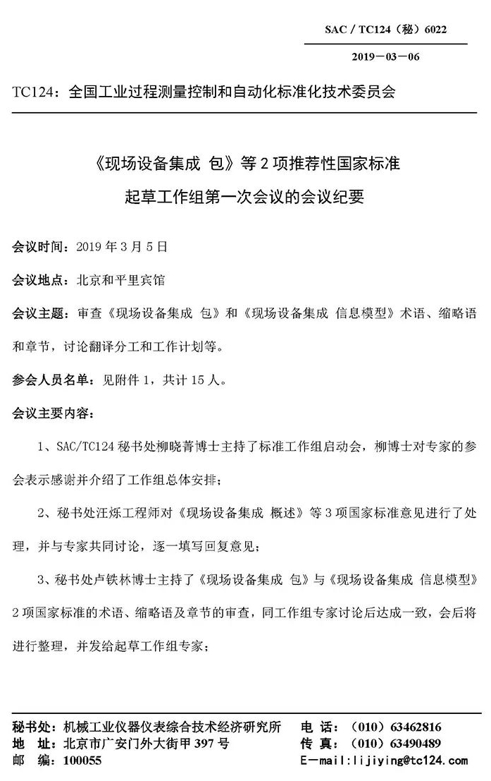 為解決當(dāng)前智能制造在集成和互聯(lián)互通標(biāo)準(zhǔn)化方面存在的問題,根據(jù)國家標(biāo)準(zhǔn)制修訂細(xì)則的要求,經(jīng)研究決定,全國工業(yè)過程測量控制和自動(dòng)化標(biāo)準(zhǔn)化技術(shù)委員會(huì)成立了2019年度 SAC/TC124國家智能制造標(biāo)準(zhǔn)《現(xiàn)場設(shè)備集成》(第 4~5部分)起草工作組,并于2019年3月5日在北京召開第一次工作組會(huì)議。此次大會(huì)有來自全國工業(yè)控制領(lǐng)域的十九位資深專家和一些長期從事標(biāo)準(zhǔn)編寫工作的人員參與,作為長期主持或參與國家標(biāo)準(zhǔn)制定的福建順昌虹潤精密儀器有限公司,也派副總陳志揚(yáng)參加了這次的啟動(dòng)大會(huì)。