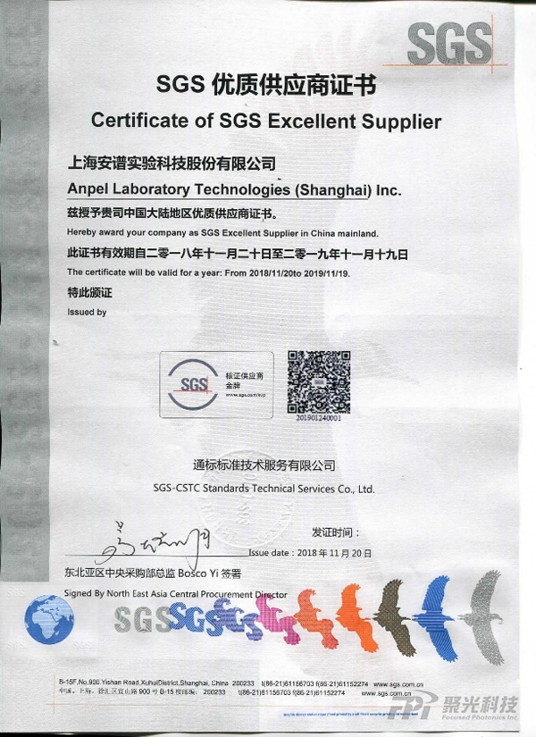 聚光科技(杭州)股份有限公司(以下簡稱“聚光科技”)下屬子公司上海安譜實驗科技股份有限公司(以下簡稱“安譜實驗”)又獲得SGS優質供應商證書了!