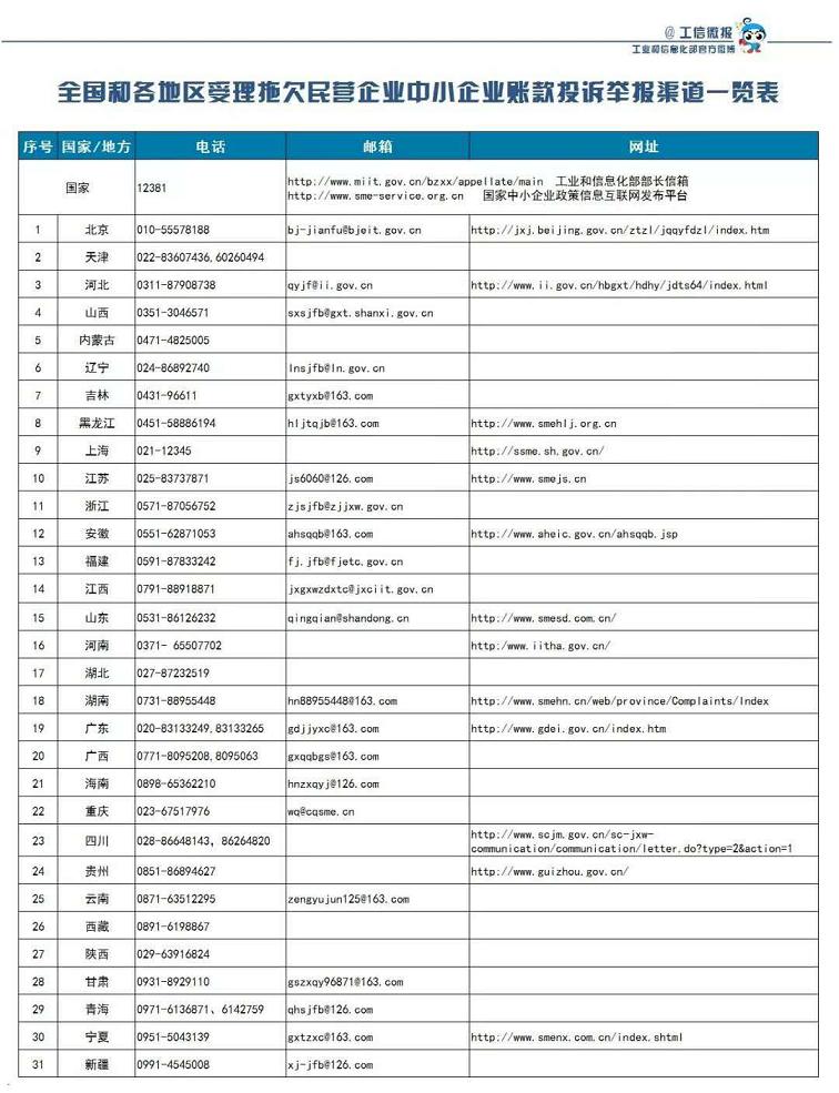 附件:全國和各地區(qū)受理拖欠民營企業(yè)中小企業(yè)賬款投訴舉報渠道一覽表