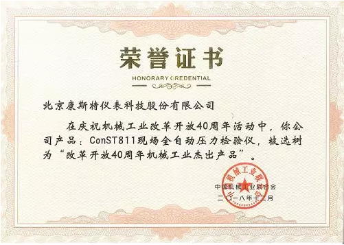 摘要:康斯特公司“ConST811現(xiàn)場全自動壓力校驗(yàn)儀”成功入選“改革開放40周年——機(jī)械工業(yè)杰出產(chǎn)品”,本活動由中國機(jī)械工業(yè)聯(lián)合會組織開展,旨在通過集中征集宣傳一批標(biāo)志性產(chǎn)品,充分展現(xiàn)機(jī)械工業(yè)拼搏奮斗的發(fā)展軌跡,展示廣大企業(yè)創(chuàng)新進(jìn)取的重要成果,以擴(kuò)大行業(yè)影響力。