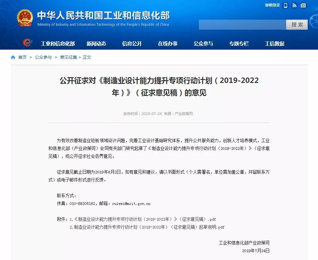 為有效改善制造業(yè)短板領(lǐng)域設(shè)計問題,完善工業(yè)設(shè)計基礎(chǔ)研究體系,提升公共服務(wù)能力,創(chuàng)新人才培養(yǎng)模式,工業(yè)和信息化部(產(chǎn)業(yè)政策司)會同有關(guān)部門研究起草了《制造業(yè)設(shè)計能力提升專項行動計劃(2019-2022年)》(征求意見稿),公開征求社會各界意見。