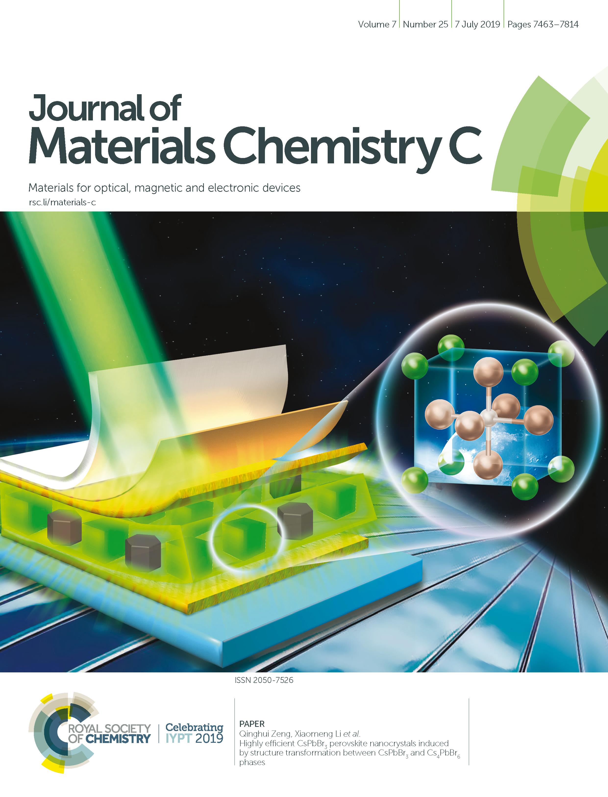 近日,中科院長春光機所曾慶輝副研究員課題組提出一種由于CsPbBr3和Cs4PbBr6的結構轉變誘導的高效熒光鈣鈦礦納米晶,所制備的鈣鈦礦納米材料的熒光量子效率可達99%,并將這種高熒光量子產率的材料應用于LED器件方面,該工作對于鈣鈦礦量子點在光電器件領域的應用具有十分重要的意義。該成果發表在英國皇家化學學會的《Journal of Materials Chemistry C》(SCI影響因子6.641)雜志上(J. Mater. Chem. C, 2019, 7, 7548--7553)。基于該項工作的出色研究成果,被雜志選為首頁封面文章。該文章的第一作者是在讀博士研究生蘇瑩,通訊作者是曾慶輝。