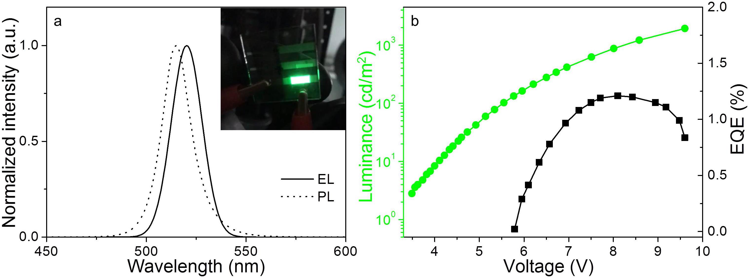 通過添加ZnBr2作為誘導劑的方法實現了從CsPbBr3量子點逐漸轉變為Cs4PbBr6納米晶,并且光致發光峰的位置保持在517nm而沒有太多偏差。在從CsPbBr3量子點到Cs4PbBr6納米晶的轉化過程中,剩余的CsPbBr3量子點的熒光量子產率仍然保持高達近99%,這是由于CsPbBr3量子點中發生的“適者生存”過程和非輻射躍遷減少的過程。有趣的是,當將誘導劑含量增加至95%時,得到了近似單相的Cs4PbBr6納米晶結構。通過監測它的吸收和發射光譜,獲得了336 nm的發射峰,這與之前的公開發表的理論研究一致,從而表明Cs4PbBr6納米晶的精確發光峰位置。進一步直接闡明,先前在CsPbBr3和Cs4PbBr6共存的混合納米晶結構中看到的綠色發射峰僅來自CsPbBr3量子點的發光而不是Cs4PbBr6納米晶。通過與香港中文大學的研究人員合作,基于優化了的CsPbBr3高熒光量子點制備了綠光LED器件,其亮度的最大值高達1941.6 cd/m2,最大外量子效率(EQE)約為1.21%,這為未來獲得高效熒光CsPbBr3鈣鈦礦量子點和相應的富有成效的光電器件開辟了新的途徑。