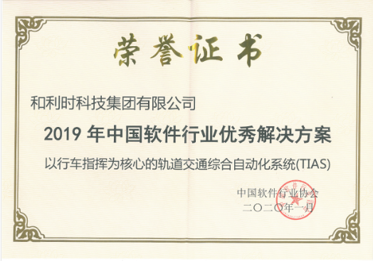 經專家委員會對參評企業技術和商業模式創新能力以及企業品牌細分領域、地域和社會影響力等因素的綜合評審,和利時科技集團有限公司獲得“2019年中國最具影響力軟件和信息服務企業”,和利時集團董事長邵柏慶憑借其在軟件領域取得的突出成就獲得“2019年中國軟件行業優秀企業家”,和利時“以行車指揮為核心的軌道交通綜合自動化系統(TIAS)”榮獲“2019年中國軟件行業優秀解決方案”。