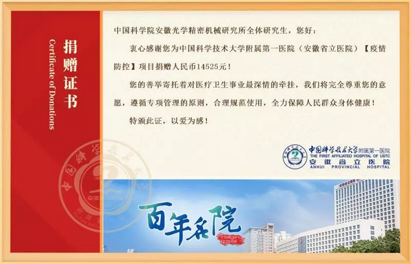 一方有難,八方支援。愛心捐款倡議發(fā)出后,黨員研究生帶頭響應(yīng),大家各盡所能。募捐活動結(jié)束后,安光所各研究生黨支部及安光所研究生會對此次捐款活動款項明細(xì)進行公示。據(jù)統(tǒng)計,共收到152位同學(xué)的愛心捐款,籌集善款14525元。所有善款最后統(tǒng)一轉(zhuǎn)賬至中國科學(xué)技術(shù)大學(xué)附屬第一醫(yī)院(即安徽省立醫(yī)院,安徽省新型冠狀病毒感染的肺炎醫(yī)療救治省級定點醫(yī)院),并注明用于新冠肺炎疫情防控工作。