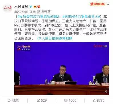 發改委也回應口罩緊缺問題:①增加供應。正全力以赴增產、擴能,醫用N95口罩需求很大。②科學合理使用。要按需、按功能使用,避免過度使用,一般防護不要擠占醫用資源。
