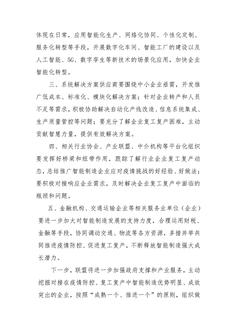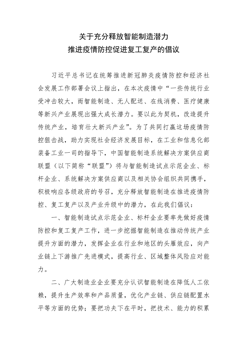 習(xí)近平總書記在統(tǒng)籌推進(jìn)新冠肺炎疫情防控和經(jīng)濟(jì)社會(huì)發(fā)展工作部署會(huì)議上指出,在本次疫情中“一些傳統(tǒng)行業(yè)受沖擊較大,而智能制造、無(wú)人配送、在線消費(fèi)、醫(yī)療健康等新興產(chǎn)業(yè)展現(xiàn)出強(qiáng)大成長(zhǎng)潛力。要以此為契機(jī),改造提升傳統(tǒng)產(chǎn)業(yè),培育壯大新興產(chǎn)業(yè)”。為了共同打贏這場(chǎng)疫情防控狙擊戰(zhàn),助力實(shí)現(xiàn)社會(huì)經(jīng)濟(jì)發(fā)展目標(biāo),中國(guó)智能制造系統(tǒng)解決方案供應(yīng)商聯(lián)盟發(fā)布《關(guān)于充分釋放智能制造潛力推進(jìn)疫情防控促進(jìn)復(fù)工復(fù)產(chǎn)的倡議》,倡議智能制造相關(guān)企業(yè)共同攜手,積極響應(yīng)各級(jí)政府的號(hào)召,充分釋放智能制造在推進(jìn)疫情防控、復(fù)工復(fù)產(chǎn)以及產(chǎn)業(yè)升級(jí)中的潛力。