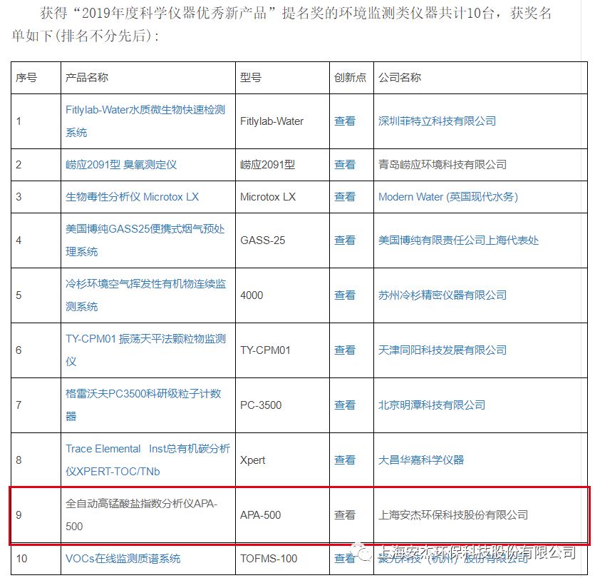 2020年3月11日,2019年度中國(guó)科學(xué)儀器行業(yè)“優(yōu)秀新品”評(píng)選活動(dòng)“提名獎(jiǎng)”揭曉,安杰科技 APA-500 全自動(dòng)高錳酸鹽指數(shù)分析儀 獲得“2019年度科學(xué)儀器優(yōu)秀新產(chǎn)品”提名獎(jiǎng)。