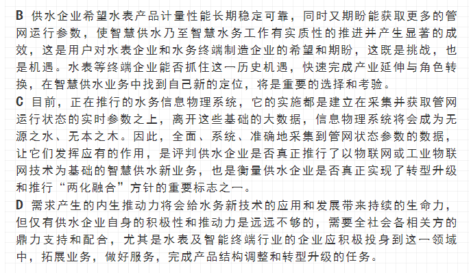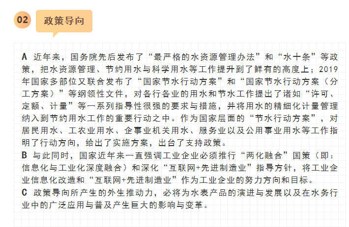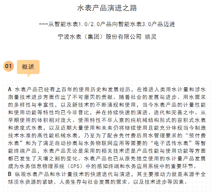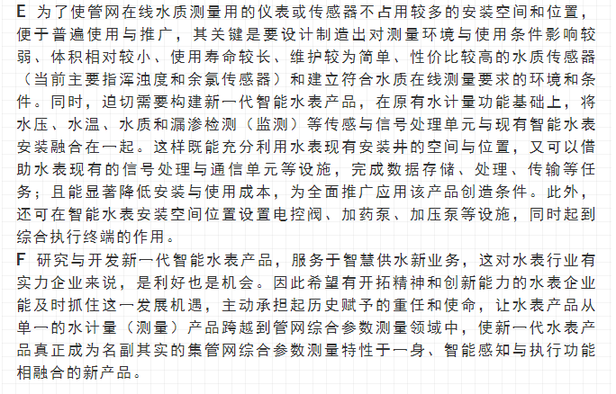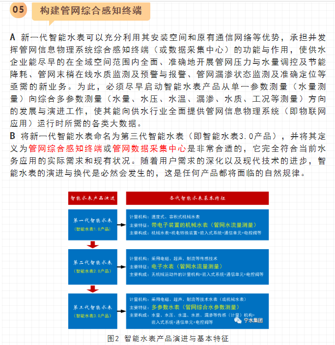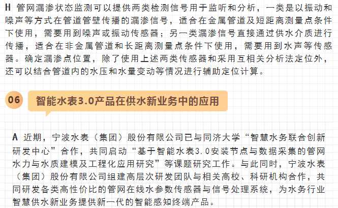 最近,寧水集團已正式啟動新一代智能水表(智能水表3.0)產品及供水新業務系統的商用化研發工作,在原先公司多個博士后課題研究基礎上進行商品化與工程化應用研究??梢灶A期,在不遠將來公司將為供水管網系統提供高性價比的水務綜合大數據,為管網現代化管理提供信息來源與決策依據(這方面詳細內容可參見附錄:“水表產品演進之路——從智能水表1.0/2.0產品向智能水表3.0產品邁進”一文)。至2020年初,公司在與浙江大學控制科學與工程學院合作基礎上,又先后與同濟大學環境科學與工程學院、寧波大學信息科學與工程學院等高校共同簽訂戰略合作協議,并聯合成立了“水務新技術研發實驗室”和“水務信息感知研發實驗室”,并將與寧波工業互聯網研究院等科研機構就水務新型傳感技術、供水關鍵核心業務等的解決方案展開合作研究。