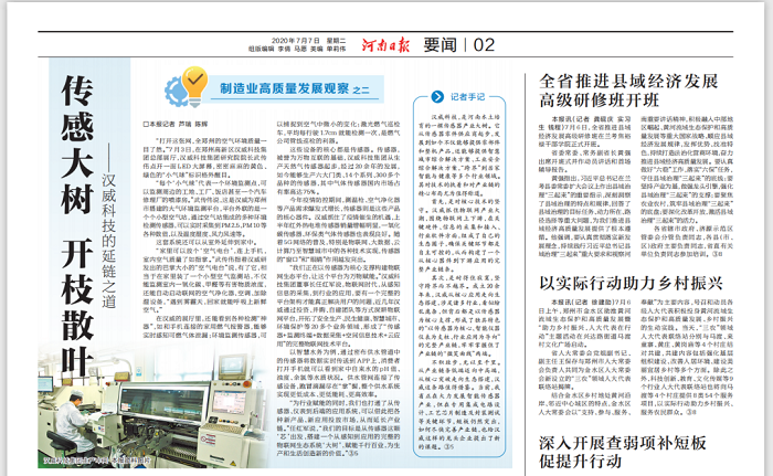 7月7日,《河南日報》要聞版大篇幅報道點贊漢威科技集團,刊出《傳感大樹,開枝散葉——漢威科技的延鏈之道》報道,評價漢威已形成了獨具特色的“以傳感器為核心,智能儀器儀表為支柱,行業應用為導向”的完整產業鏈,牢牢掌握住了物聯網產業鏈的“微笑曲線”的兩端。