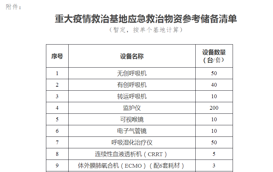 附件:重大疫情救治基地應(yīng)急救治物資參考儲備清單