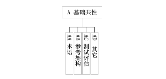 基礎共性標準主要針對人工智能基礎進行規范, 包括術語、 參考架構、 測試評估等部分, 如下圖所示。