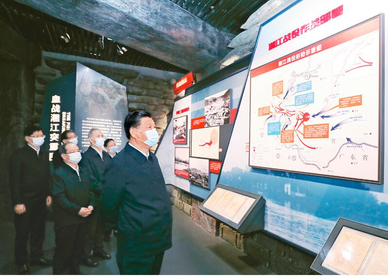 2021年4月25日至27日,中共中央總書記、國家主席、中央軍委主席習近平在廣西考察。這是25日上午,習近平在桂林市全州縣,參觀紅軍長征湘江戰役紀念館。 新華社記者 鞠鵬/攝