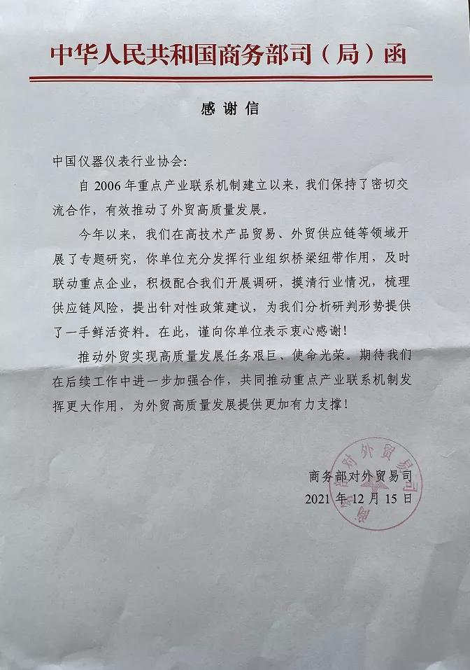 近日,工業和信息化部重大技術裝備辦公室、商務部對外貿易司向中國儀器儀表行業協會發來感謝信,對協會2021年在發揮行業組織橋梁紐帶作用、凝聚行業發展共識、反映行業運行訴求、促進行業健康發展、為相關部門提供信息支撐和決策參考等方面發揮的作用和開展的工作給予高度評價,對協會積極配合部委工作給予的大力支持表示誠摯感謝。