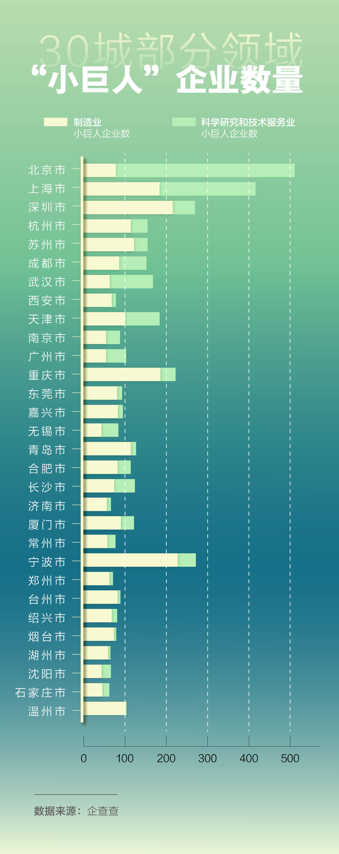 前30強城市中,除了北京之外,在科學(xué)研究和技術(shù)服務(wù)業(yè)“小巨人”企業(yè)超過100家的城市還有上海(233家)和武漢(105家)。