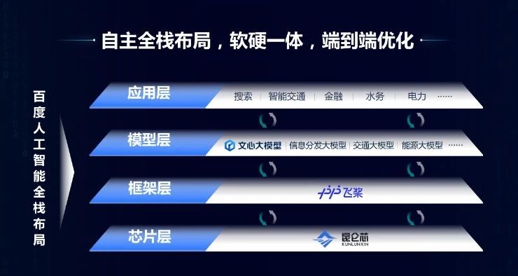 這方面百度有比較明顯的優(yōu)勢,我們在四層當(dāng)中每一層都有比較領(lǐng)先的產(chǎn)品,比如說芯片層有昆侖芯。這個也做了有十年之久,最早是因為搜索應(yīng)用需要,我們買別人的芯片,畢竟太貴了,所以自己開發(fā)了。框架層是飛槳,飛槳今天在中國的市場份額第一。在模型層是文心大模型,其實除了文心一言,它是對標(biāo)ChatGPT的之外,我們還有很多行業(yè)大模型,如交通大模型、能源大模型等。應(yīng)用層的話,像百度搜索等都是我們比較領(lǐng)先的應(yīng)用。
