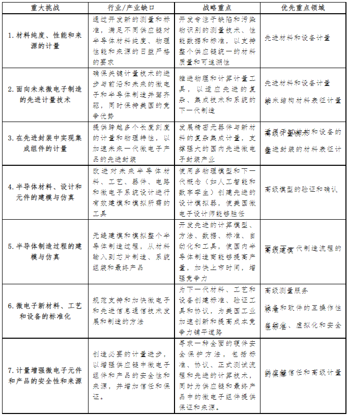 2022年9月的《美國半導(dǎo)體行業(yè)的戰(zhàn)略機遇》報告中,確定了從計量學(xué)角度需要重點關(guān)注的7大挑戰(zhàn),以實現(xiàn)美國領(lǐng)導(dǎo)的全球半導(dǎo)體行業(yè)的未來國家愿景。到2022年11月,芯片研發(fā)計量計劃將其投資組合進(jìn)一步細(xì)化為10個優(yōu)先重點領(lǐng)域,以解決最關(guān)鍵的計量研發(fā)缺口。七大挑戰(zhàn)及對應(yīng)優(yōu)先重點領(lǐng)域如下: