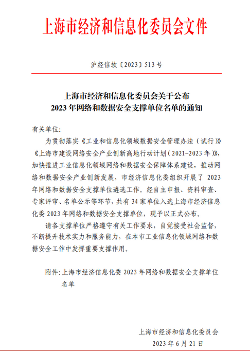 6月21日,上海市經濟和信息化委員會(以下簡稱“經信委”)發布2023年網絡和數據安全支撐單位名單(滬經信軟[2023]513號),上海工業自動化儀表研究院有限公司(以下簡稱“自儀院”)在風險信息報送、工業互聯網安全分類分級、工業數據安全分類分級、風險評估、應急保障領域成功入選。