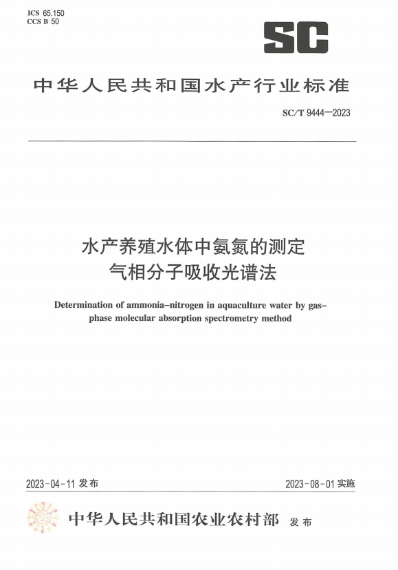 近期,為保護(hù)農(nóng)業(yè)水產(chǎn)養(yǎng)殖水體污染,改善養(yǎng)殖水環(huán)境質(zhì)量,中華人民共和國(guó)農(nóng)業(yè)農(nóng)村部2023年4月11日發(fā)布《水產(chǎn)養(yǎng)殖水體中氨氮的測(cè)定 氣相分子吸收光譜法》(SC/T 9444-2023)標(biāo)準(zhǔn),該標(biāo)準(zhǔn)是由中國(guó)水產(chǎn)科學(xué)研究院珠江水產(chǎn)研究所起草,已于2023年8月1日實(shí)施。上海安杰智創(chuàng)科技股份有限公司作為《水產(chǎn)養(yǎng)殖水體中氨氮的測(cè)定 氣相分子吸收光譜法》(SC/T 9444-2023)標(biāo)準(zhǔn)的驗(yàn)證單位,參與該標(biāo)準(zhǔn)的起草工作。