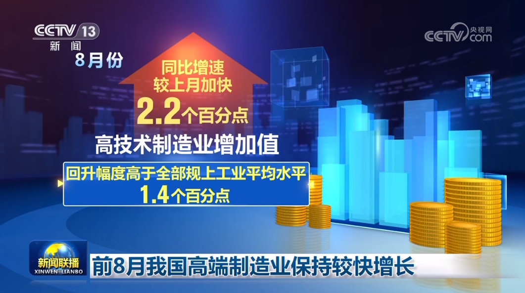 8月份,高技術(shù)制造業(yè)增加值同比增速較上月加快2.2個百分點,回升幅度高于全部規(guī)上工業(yè)平均水平1.4個百分點。從行業(yè)看,電子工業(yè)專用設(shè)備制造、電子器件制造等增加值均保持兩位數(shù)增長;航空航天相關(guān)行業(yè)繼續(xù)快速發(fā)展,其中,飛機(jī)制造、其他航空航天器制造、航空航天器修理分別增長11.6%、15.9%、31.0%。