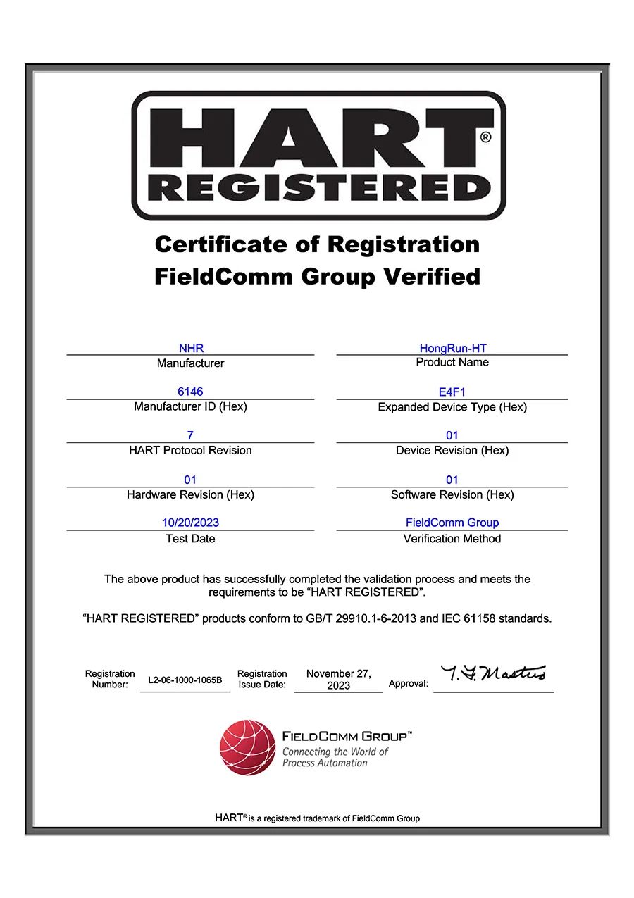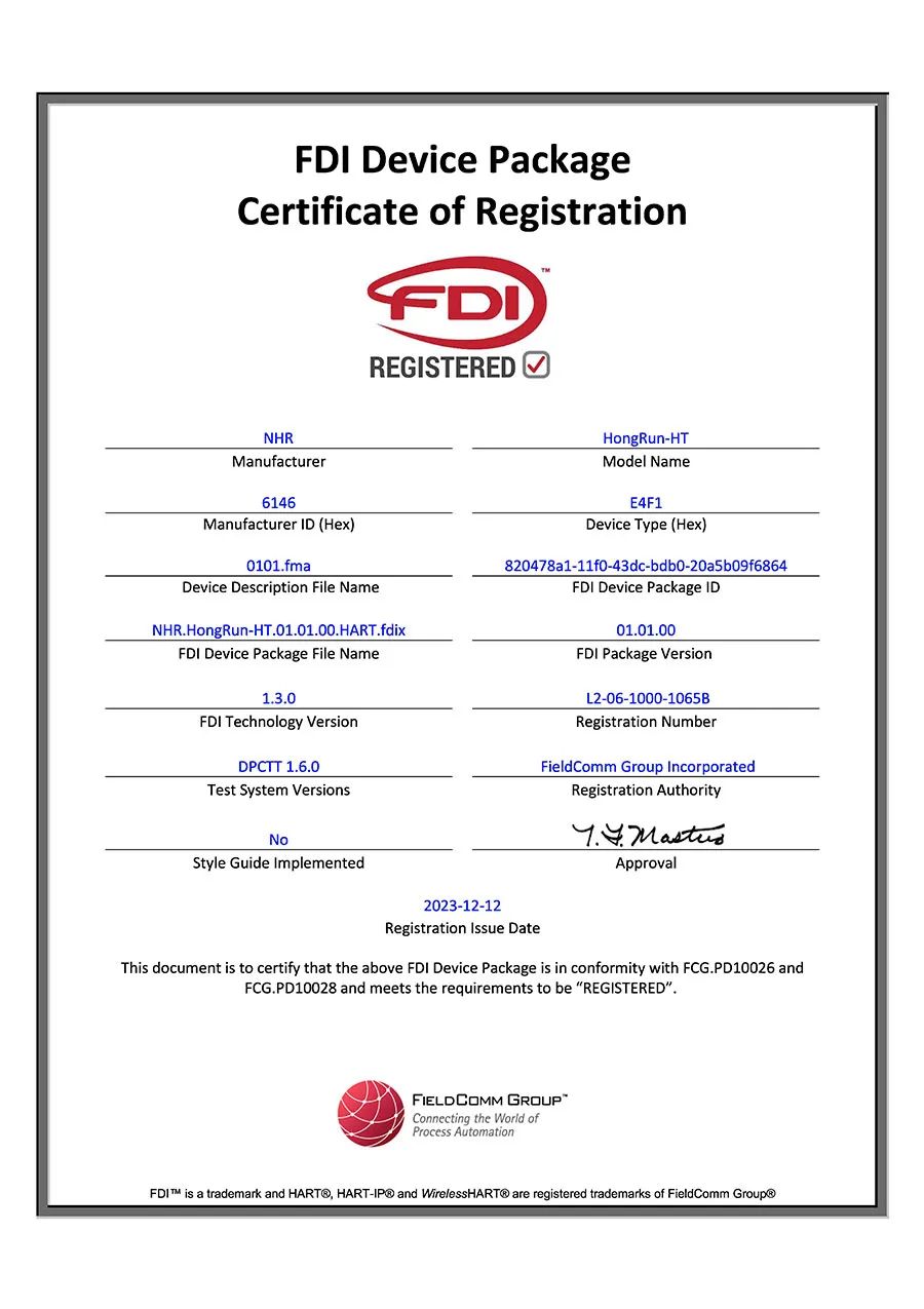 近日,虹潤(rùn)公司溫度變送器通過(guò)“美國(guó)HART基金會(huì)” 產(chǎn)品認(rèn)證和FDI包文件的權(quán)威認(rèn)證,成為國(guó)內(nèi)首家通過(guò)FDI認(rèn)證的企業(yè)。這是虹潤(rùn)智能儀表發(fā)展歷程中取得的又一項(xiàng)重要認(rèn)證,表明該產(chǎn)品在協(xié)議技術(shù)認(rèn)證等方面得到了國(guó)際權(quán)威認(rèn)可。HART認(rèn)證符合GB/T 29910.1-6-2013及IEC 61158的規(guī)定,目前可支持HART 7.9版本協(xié)議。
