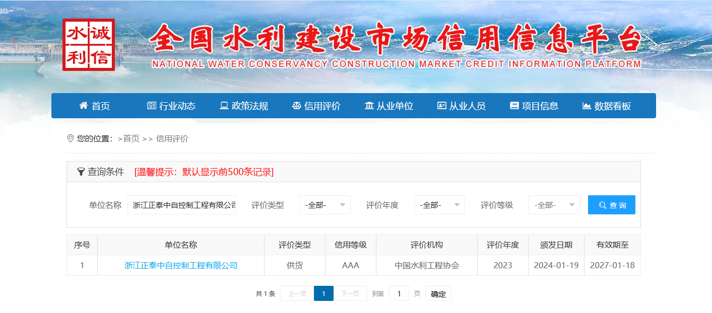 正泰中自榮獲AAA級信用企業,是對公司品牌價值和綜合實力的充分肯定,為公司開展水利業務、拓展水利市場創造了有利條件。