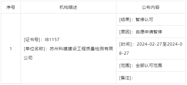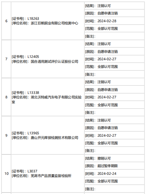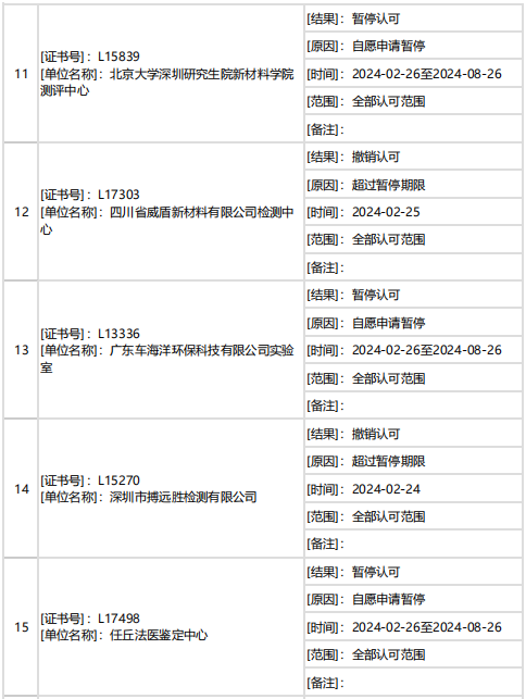 據(jù)中國合格評定國家認(rèn)可委員會(CNAS)消息,2月下半月共計27家機(jī)構(gòu)暫停/撤銷/注銷認(rèn)可資質(zhì)。7家機(jī)構(gòu)因超過暫停期限被撤銷認(rèn)可,其他機(jī)構(gòu)為自愿申請暫停/注銷認(rèn)可。