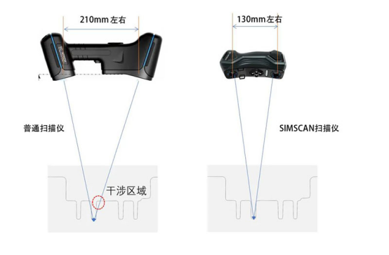 擺在研發團隊面前的第一個難題是:如何在縮短相機基線的情況下,確保高精度?SIMSCAN體積小,相應地,相機基線距離比普通掃描儀更短。面對這一變化,研發團隊采用圖像增強等技術和全新的亞像素特征提取算法,很大程度改善設備精度,并重新設計了基于短基線的標定系統;同時利用相機夾角變小的特性,提高了深孔、流道、凹槽、縫隙等狹小特征的掃描能力。