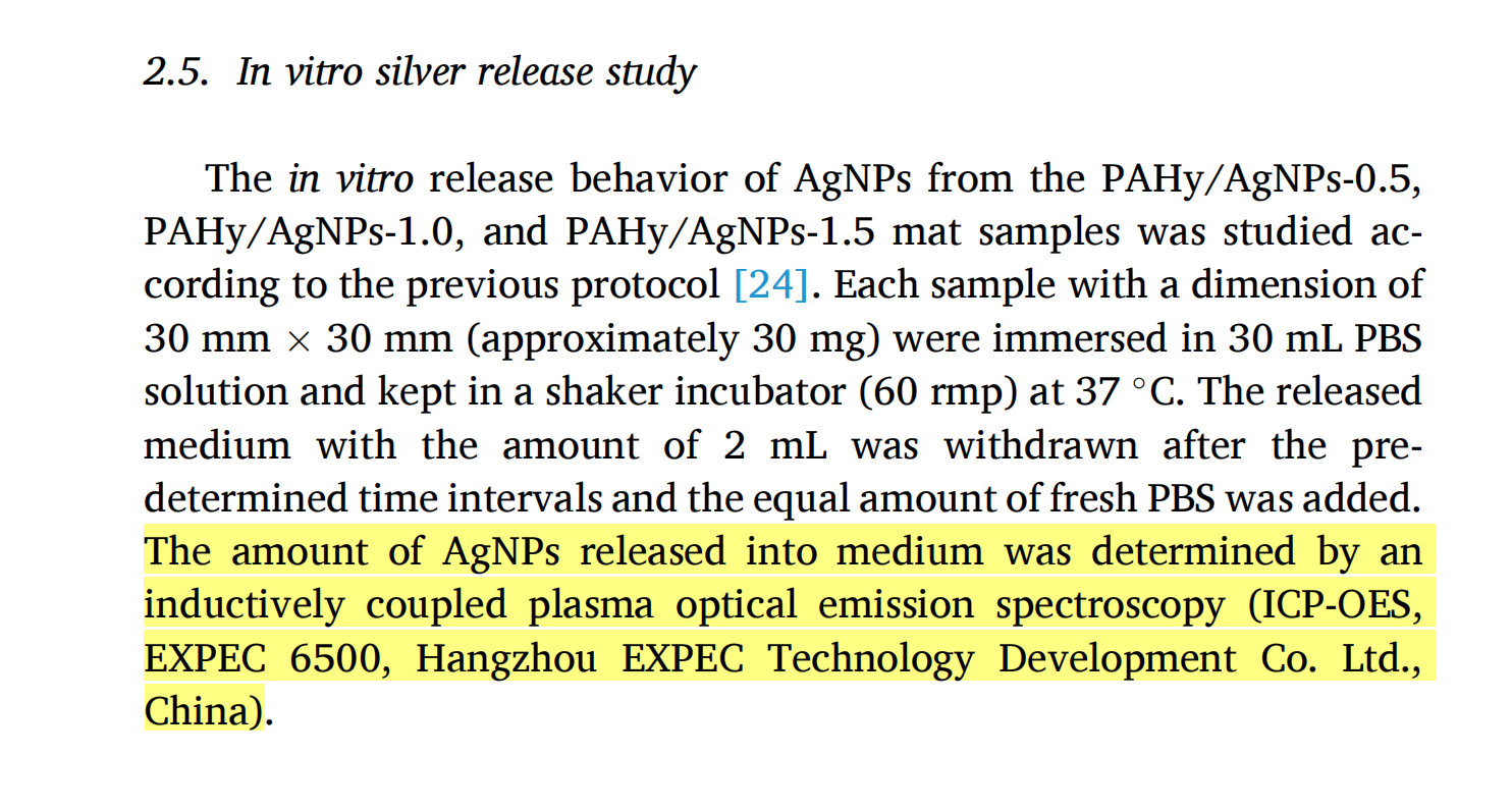 負載納米銀的聚天冬酰肼納米纖維水凝膠敷料中銀的釋放行為對其抗菌性能和細胞毒性有著決定性的影響。研究團隊采用譜育科技EXPEC 6500 電感耦合等離子體發射光譜儀(ICP-OES)測定了銀的釋放量。為銀釋放行為對水凝膠敷料的抗菌性和細胞毒性影響分析提供有力的數據支撐。